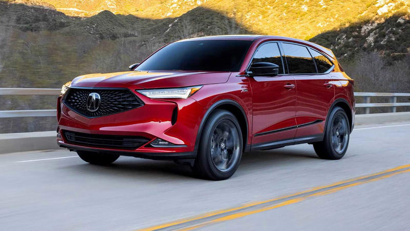 A front, left hand-side three-quarter shot of a 2023 Acura MDX