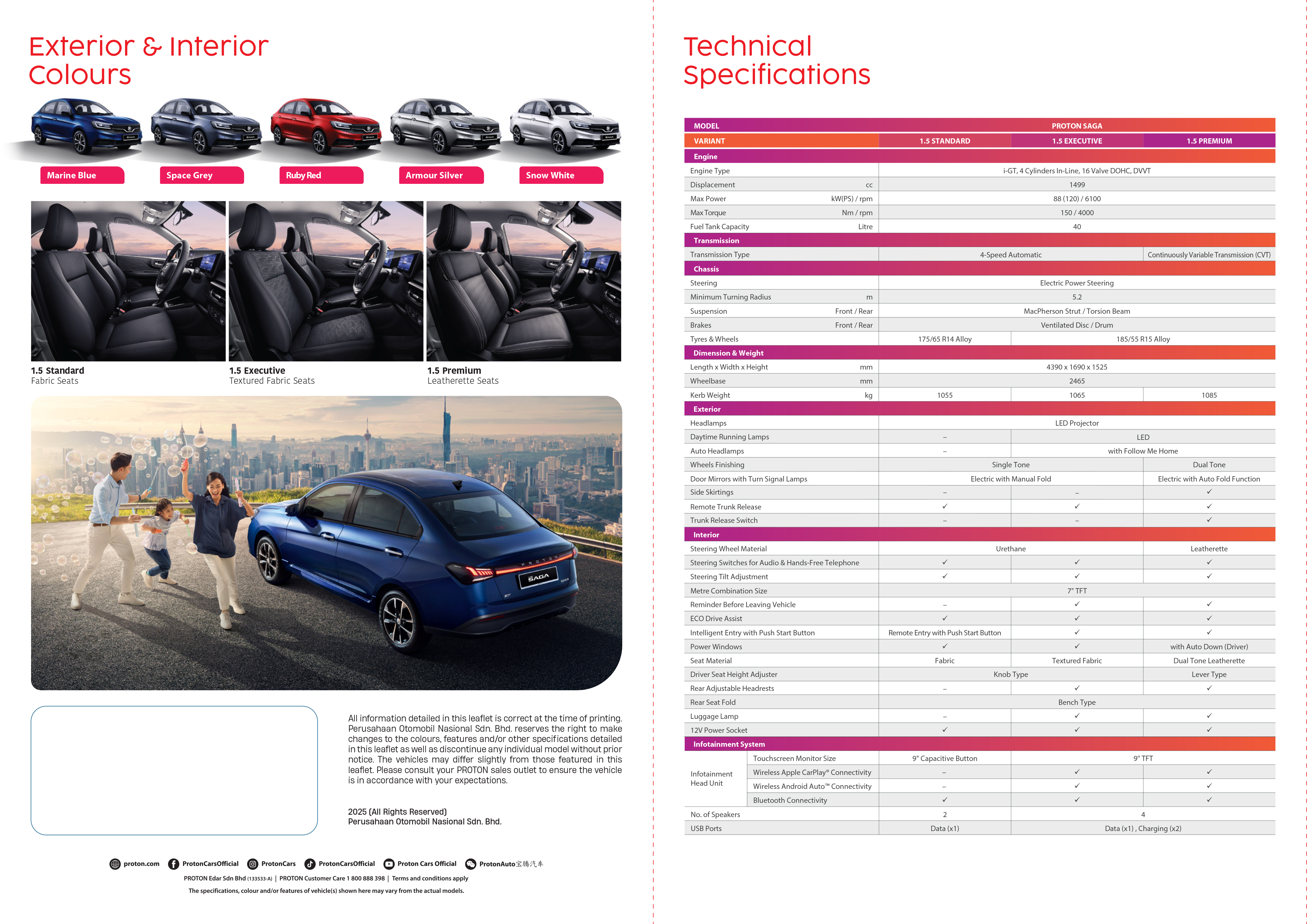 The new Proton Saga was launched last week, but it was only yesterday that we got our first proper look at the base Standard model. With this, we now know the entire equipment list of each of the three variants, which also include the Executive and the top-spec Premium. First, the prices. To reiterate, the Standard is priced at RM37,990, the Executive at RM43,990 and the Premium at RM48,990. These figures are on-the-road without insurance, inclusive of a RM1,000 rebate up to the end of the year. There are several other early-bird offers as well, which you can read about in our comprehensive launch report. We’ll begin the comparison with the thing they all share – the 1.5 litre BHE15-CFN port-injected, naturally-aspirated four-cylinder engine making 120 PS at 6,100 rpm and 150 Nm of torque between 4,000 and 5,000 rpm. This means the Standard is now the cheapest 1.5 litre car in Malaysia, costing nearly RM13,000 less than the Perodua Myvi 1.5 X. The Saga also punches above its weight in terms of output, being only narrowly beaten by the Honda City (121 PS) in power and beating it in torque (145 Nm). However, while the Standard and Executive models retain the previous Aisin four-speed automatic gearbox, the Premium returns to a Punch CVT. Controversial I know, but it’s the stepless transmission that is more efficient, delivering a fuel consumption figure of 4.9 litres per 100 km, versus 5.1 litres per 100 km on the others. This figure nearly matches the Perodua Bezza 1.3 (4.8 litres per 100 km) while being significantly more powerful. Proton Saga 1.5 Standard A/T We’ve already talked endlessly about what’s new, so we’ll keep it brief. The new front fascia features redesigned headlights that come with LED projectors (yes, even on the Standard), plus a too-big grille tied together with the Ethereal Bow bar that envelops the Proton roundel. The taillights are also new (and illuminated with LEDs) and join a sleeker, taller “aero” boot lid. The Standard’s headlights make do with L-shaped LED positioning lights, while the Executive and Premium graduate to full-blown daytime running lights. The part numbers are common across all three, however, so the difference is merely software. The Ethereal Bow and the also-new door handle strips are finished in silver on the Standard and chrome on the other two, and the wheels are carried-over 14-inch silver alloys on the Standard; the Executive and Premium gain snazzier 15-inch “arrow” rollers, with the Premium’s also receiving a two-tone finish. Also exclusive to the Premium is an illuminated bar joining the taillights, which also houses an external boot lid release; on the other models, you’ll either have to press a button on the key or reach in and pull a lever. Proton Saga 1.5 Executive A/T It’s a sea change on the inside, too, with a horizontal dashboard design and pill-shaped air vents. Dominating proceedings is a tombstone of a display panel, and even the Standard receives a new seven-inch digital instrument display – something you won’t find elsewhere in this price range. This does not extend to the nine-inch touchscreen, which can only found on the Executive and Premium; the Standard retains the outgoing model’s radio/Bluetooth player with fiddly capacitive touch buttons. It being fully integrated with the instrument display on a single panel will likely make it harder and more expensive to replace the head unit, but we’re sure the aftermarket will find a way regardless. Losing the touchscreen also means the Standard loses out on the new wireless Apple CarPlay and Android Auto function as well as a reverse camera. It also gets just two speakers as opposed to the usual four, with the rear door perforations opening up to gaping blank holes. Proton Saga 1.5 Premium CVT Elsewhere, you get three different upholstery options – regular fabric on the Standard, textured fabric on the Executive and faux leather on the Premium. The driver’s seat itself also features a more ergonomic ratcheting height adjuster lever that moves the entire seat, although this is still reserved for the Premium, with the others stuck with the same rotary knob that lifts only the seat base. Last but not least, keyless entry is only offered on the Executive and Premium, but all models now get a push-button starter. Safety-wise, the Saga comes as standard with two airbags and stability control. For the full experience, you’ll have to spring for the Premium, which now features six airbags and advanced driver assistance systems like autonomous emergency braking, lane departure warning, blind spot monitoring and auto high beam. Again, the Premium is the one with the CVT, so it’s take it or leave it – CVT, or no ADAS. The full variant breakdown is as follows: 2026 Proton Saga 1.5 Standard – RM37,990Gets as standard: Mechanicals 1.5 litre DOHC i-GT PFI engine 1,499 cc naturally-aspirated dual-VVT four-cylinder petrol 120 PS at 6,100 rpm, 150 Nm of torque at 4,000-5,000 rpm Aisin four-speed automatic transmission Front-wheel drive MacPherson strut suspension (front), torsion beam (rear) Electric power steering Ventilated disc brakes (front), drums (rear) 5.1 litres per 100 km combined fuel consumption (MDC) Exterior LED projector headlights with LED positioning lamps Silver Ethereal Bow grille bar LED taillights Silver door handle strips 14-inch silver alloy wheels with 185/60 R14 tyres Interior Push-button start Black interior Grey headliner Manual air conditioning Manual seats Driver’s side seat base height adjuster Fabric upholstery Urethane multi-function steering wheel with tilt adjustment 7-inch digital instrument display Bluetooth/MP3/radio head unit One front USB port (USB-A) 2 speakers Folding rear bench 420 litres boot space Safety Two airbags ABS with EBD and brake assist Traction control and stability control Hill start assist Rear seat reminder Rear parking sensors 2026 Proton Saga 1.5 Executive – RM43,990Adds on: Exterior Aut