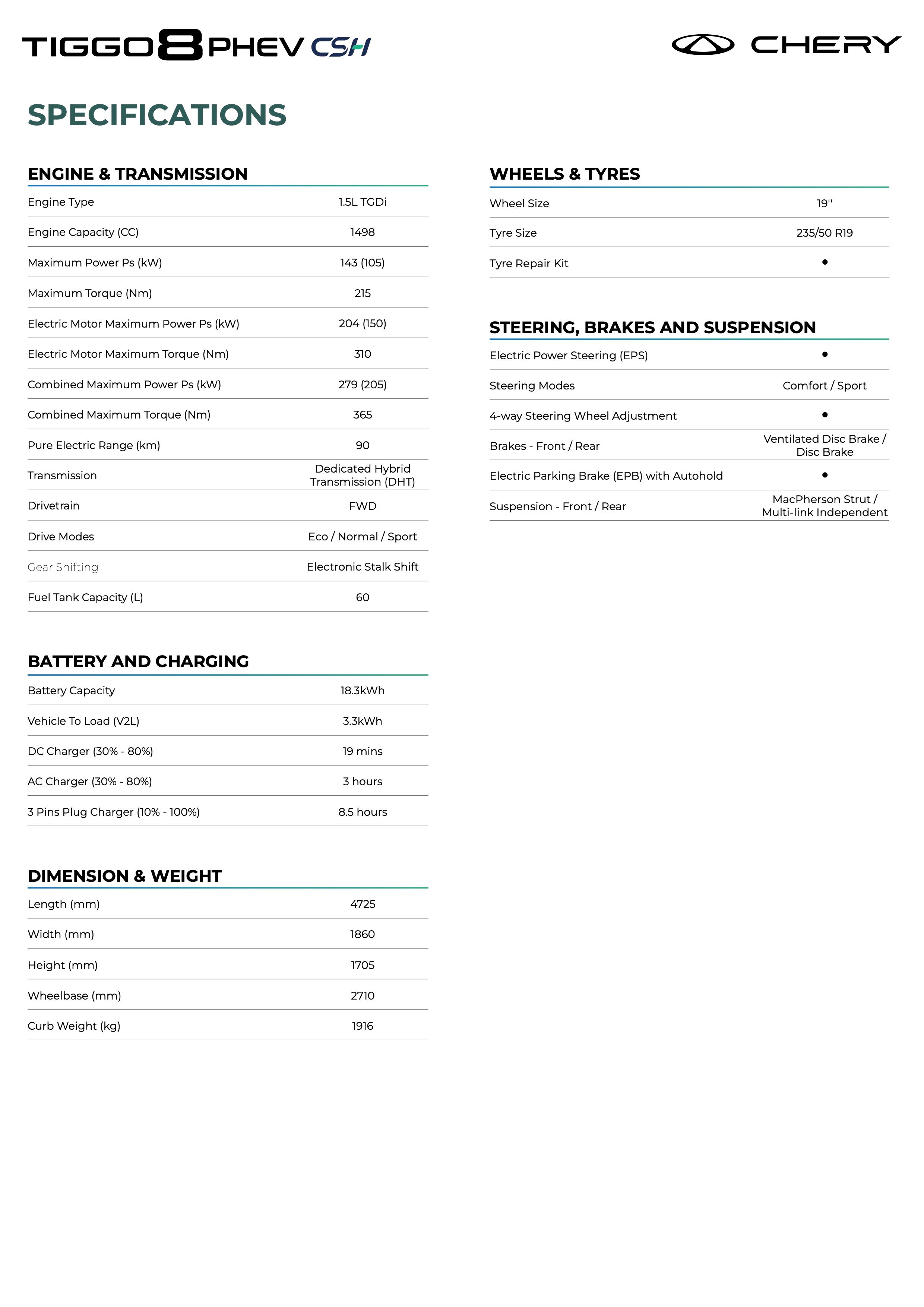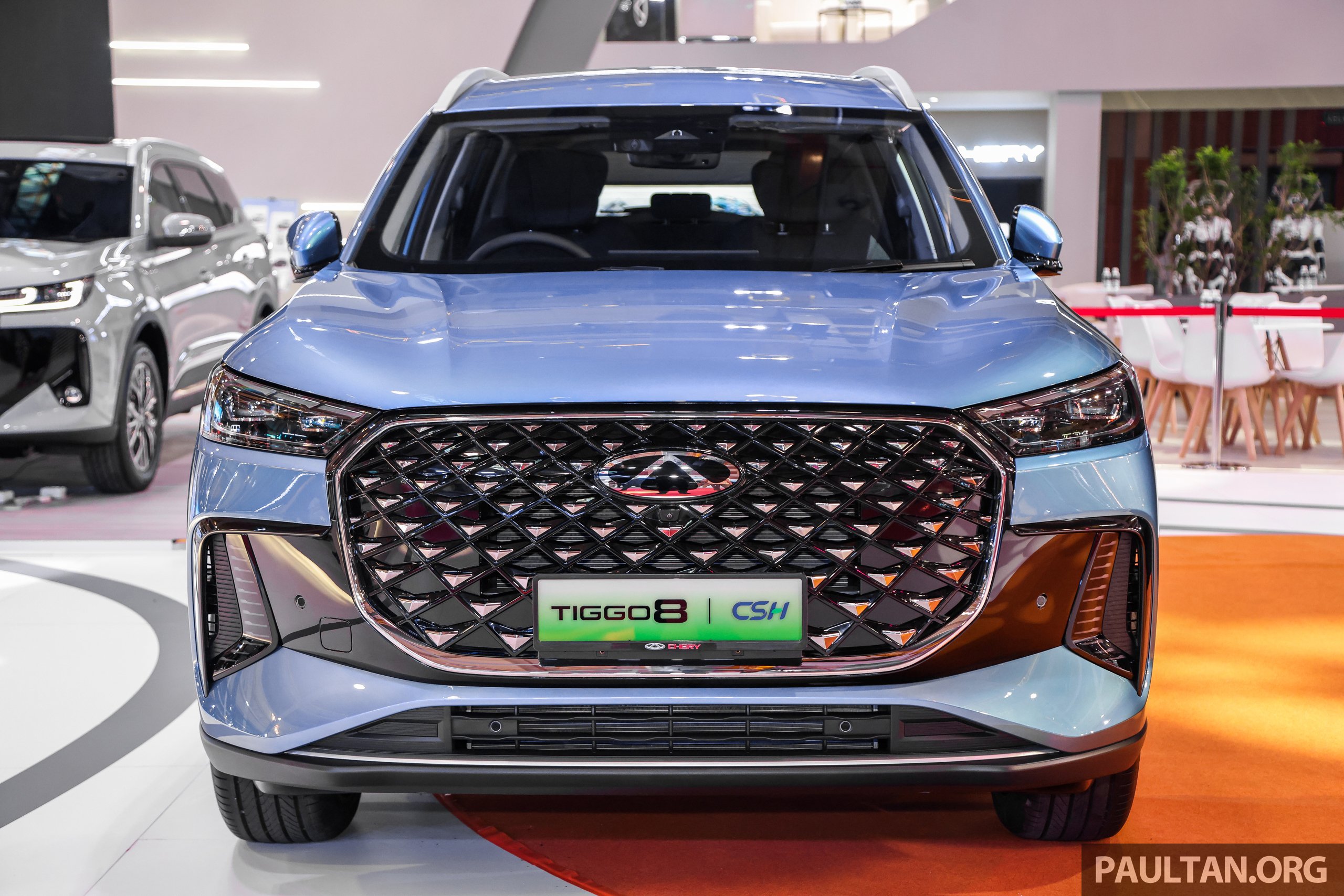 Chery Malaysia today launched plug-in hybrid (PHEV) versions of the Tiggo 7 and Tiggo 8 SUVs, both of which carry the CSH (Chery Super Hybrid) moniker. This story focuses on the bigger one with seven seats. Locally assembled (CKD) in Kulim, the Tiggo 8 PHEV is yours for RM159,800, OTR before insurance. Comparatively, the concurrently-launched five-seat Tiggo 7 PHEV asks for RM129,800, while the Tiggo 8 Pro cost RM159,800 at launch (this continues to be sold alongside). Based on the first-gen facelift (see the new second gen here), the Tiggo 8 PHEV’s face differs slightly from our non-facelift Tiggo 8 Pro’s (with the Max update) – the headlamp internals have dashed eyebrows, the grille has a chrome and gloss black surround plus a different internal pattern, and the front bumper is different, now featuring 7-shaped side cut-outs. The Chery logo on the nose is illuminated and there are cornering lamps that follow steering movement. Round the side, you’ll see flush door handles and new 10-spoke alloys (still 235/50R19), and the T8P’s big chromed side blade is nowhere to be found here; instead there’s a thin chrome strip along the bottom of the doors. The only differences at the back are the model badging and the diffuser element (T8P has quad tailpipes; this PHEV has twin parallelogram-shaped units). The functional roof rails carry over. But the interior is completely unrecognisable from the T8P’s – only the steering wheel is carried over. Where the T8P has conjoined twin screens, the PHEV has two separate screens (10.25-inch gauge cluster and 15.6-inch centre touch-screen, Qualcomm Snapdragon 8155-powered), and where the T8P has a horizontal dash, the PHEV’s is T-shaped, with a centre console that houses the centre air vents, 50W wireless charger, twin cupholders, drive mode dial (Eco/Normal/Sport) and EV/HEV switch. Where’s the gear lever? It’s now the right-hand-side steering wheel stalk. New seat upholstery (synthetic leather, driver’s seat is six-way powered while the front passenger’s is four-way powered) and door cards too, and you’ll need to go into the screen to adjust the dual-zone air-con, as the T8P’s long horizontal row of climate controls is absent here. You’ll also find Comfort and Sport steering modes, an HD dashcam, double-glazed glass, 10 Sony speakers and 64-colour ambient lighting. Also standard are all-LED auto lighting, sequential indicators, a cooled front centre armrest box, a front passenger seat ‘boss switch’, an auto-dim rear-view mirror, wireless Apple CarPlay/Android Auto, a 540-degree camera and voice command. The CSH series-parallel hybrid powertrain is shared between the T7 and T8 PHEVs. A 143 PS/215 Nm 1.5 litre turbo Miller-cycle four-cylinder engine joins forces with a 204 PS/310 Nm electric motor that’s integrated within a stepless dedicated hybrid transmission (DHT150). Altogether, output is 275 PS and 365 Nm of torque. Chery claims 44.5% thermal efficiency for the engine, 98% mechanical efficiency for the DHT, a combined range of up to 1,200 km (contributed by a 60-litre tank), an EV-only range of up to 90 km and a 500 mm wading depth. There’s also 3.3-kW vehicle-to-load (V2L). The company is keen to emphasise the IP68-certified battery’s durability – besides being dust- and water-resistant, and capable of withstanding up to 95 degrees Celsius, the 18.3 kWh LFP battery was recently submerged in a metre-deep tank of seawater for over 53 hours before being reinstalled in a Tiggo 8 PHEV (and it still worked) as part of a test in Jakarta. Earlier in China, the Tiggo 9 PHEV vehicles endured a series of extreme safety tests, including spiral rollovers, a head-on vehicle collision, a seven-car stack test, 55 km/h side intrusion, a 4.9-metre vertical drop and 720 hours of salt spray exposure. In terms of charging, the battery can swallow up to 40 kW DC (30-80% in 19 minutes) and up to 6.6 kW AC (30-80% in three hours), while three-pin charging would get you from 10-100% in 8.5 hours. If any of the above-mentioned numbers seem familiar to you, it’s because the CSH system is closely related to Jaecoo’s Super Hybrid System (SHS). Safety? The Chery Tiggo 8 PHEV gets eight airbags and ADAS functions including AEB, ACC, every conceivable lane function including lane change assist, rear cross traffic braking and rear cross traffic alert, but it omits the multi-collision braking and driver monitoring system found on the Tiggo 7 PHEV, instead featuring driver fatigue monitoring system. You can have your Tiggo 8 PHEV in Aurora Green, Khaki White or Carbon Black. Buy one and you’ll get a seven-year/150,000 km vehicle warranty, an eight-year/160,000 km battery power pack, power motor and hybrid control unit warranty, plus five years’ free labour service (six service intervals). Moreover, if your battery’s state of health dips under 70% while still under warranty, you’ll get a one-to-one exchange, which could be the first of its kind for a PHEV in Malaysia. Chery Tiggo 8 PHEV CSH previewed at Malaysia Autoshow 2025 Compare prices between different insurer providers to save the most on your car insurance renewal compared to other competing services. Many payment method supported and you can pay with instalment using Grab PayLater or Shopee SPayLater.