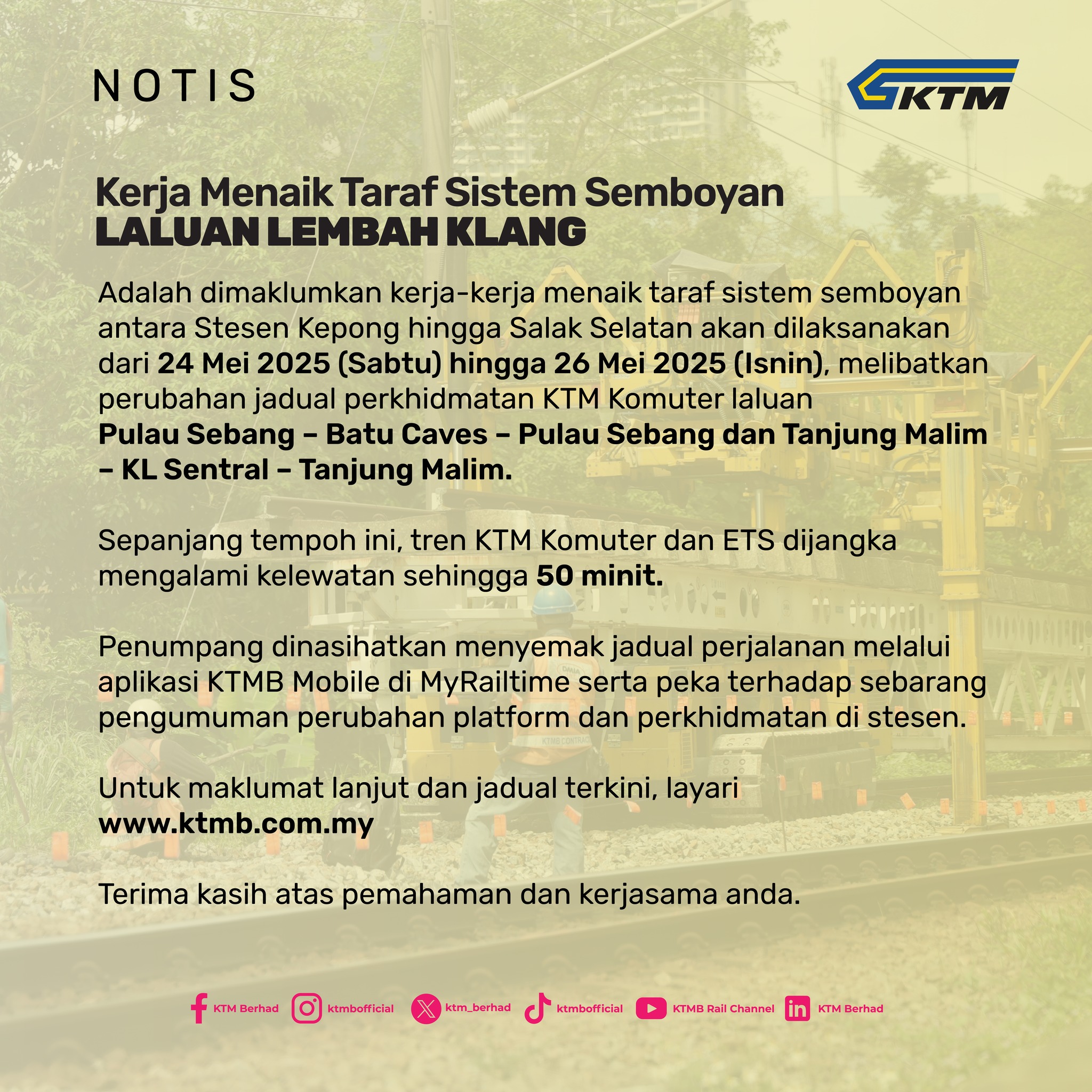 Source: KTM Komuter, ETS to have up to 50 min delays from May 24-26 – trains from north end at Kepong Sentral