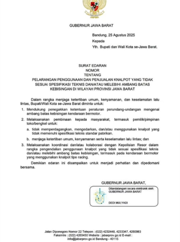 Source: Gubernur Dedi Mulyadi Resmi Larang Knalpot Brong di Jawa Barat, Berlaku hingga RT dan RW