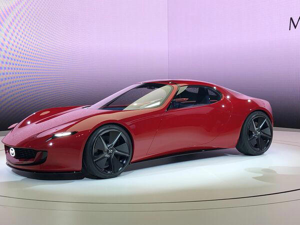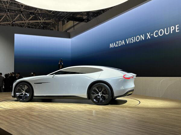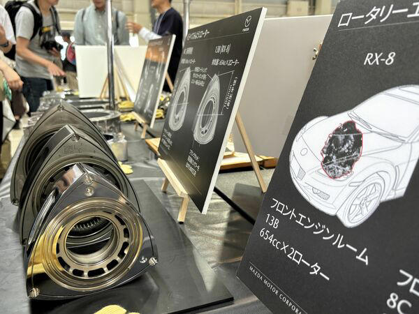 マツダが10月29日に発表したコンセプトカー「MAZDA VISION-X COUPE」(写真:筆者撮影)マツダは10月29日、ジャパンモビリティショー2025(一般公開10月31日〜11月9日)での記者会見で、コンセプトカー「VISION-X COUPE」を世界初公開した。ロータリーエンジンを搭載した2ドアクーペであるものの、自動車メディアなどが予想記事で紹介した「(仮称)RX-9 コンセプト」とはイメージが違う。マツダが2015年の第44回東京モーターショーでサプライズ発表した「RX-VISION」は量産化されることなく、ゲーム「プレイステーション」のソフトウェア専用モデルとして活躍するにとどまった。今回、なぜRX-9 コンセプトは登場しなかったのか。その背景について、近年のマツダの状況を振り返りながら検証した。(桃田 健史:自動車ジャーナリスト) まず、「VISION-X COUPE」の車両スペックから見ていこう。 ボディサイズは全長5050mm×全幅1995mm×全高1480mmで、マツダの真骨頂「魂動デザイン」によるインパクトが強い。 パワートレインはツインローターにターボを使い、モーターと駆動用バッテリーを搭載するプラグインハイブリッド車でシステム出力は510馬力。航続距離はEVモードで160km、ハイブリッドシステム併用で800kmだ。「MAZDA VISION-X COUPE」(写真:筆者撮影) 燃料に微細藻類由来のカーボンニュートラル燃料を用い、マツダが独自開発したCO2回収技術「マツダ モバイル カーボン キャプチャー」も搭載することで、走行時のCO2排出量を理論上実質ゼロ以下にすることを目指す。 このように環境面を含めてロータリーエンジン技術の進化はあるにせよ、日本を含めた各国の道路事情や想定される価格などを考慮すると、このままの姿では、かつて発表したコンセプトカー「RX-VISION」と同じように、量産化は難しいだろう。 そもそも「VISION」を名乗るモデルは将来的な企業戦略の方向性を示す「概念を具現化」することが目的であり、量産を前提としていない。そして今回のVISIONは、2035年を想定したコンセプトカーである。ファン待望のモデルは登場せず マツダファンが今回期待していたのは、いわゆるコンセプトカーとしてのロータリースポーツではなく、ジャパンモビリティショー2023で登場した「アイコニック SP」ベースで量産化を目指すロータリースポーツのコンセプトモデルだった。自動車メディアやマツダファンはそれを「RX-9 コンセプト」と、期待を込めて呼んでいた。マツダが「ジャパンモビリティショー2023」に出展し来場者の注目を浴びた「アイコニック SP」。これをベースに、量産化に向けたコンセプトモデルの発表が期待されたが……(写真:筆者撮影) アイコニック SPのボディサイズは、全長4180mm×全幅1850mm×全高1150mmであることから、「RX-7の復活」「RX-9の可能性」といった声がマツダファンの間で広がった。 毛籠勝弘(もろ まさひろ)社長を始めとしたマツダ幹部らはこれまでにも、「アイコニックSPに対するユーザーやメディアの評価を受けて、その次を考えていく」と量産化に向けた考えを示しており、マツダファンの期待は否応なしに高まっていた。マツダ、ロータリーエンジン開発の歴史 実際、ロータリーエンジンの開発も着実に進んでいる。2012年にマツダ本社としてロータリーエンジンの量産は終了したものの、ロータリーエンジンの研究開発は地道に続けており、その成果が排気量800ccの「8C」型ロータリーエンジンだ。ロータリーエンジンに関する技術展示「マツダ ファンフェスタ イン 富士スピードウェイ2025」にて(写真:筆者撮影) 8Cを発電機として使うプラグインハイブリッド車「MX-30 ロータリーEV」を2023年11月に発売している。 2024年2月には、次世代に適合したロータリーエンジンの研究開発を加速させるため、当時のパワートレイン開発本部パワートレイン技術開発部内で「RE(ロータリーエンジン)開発グループ」が復活。マツダの主要市場での規制対応やカーボンニュートラル燃料の活用などを視野に入れた取り組みが始まっていた。 さらに、同年5月にはマツダ、トヨタ、スバルが共同会見を開き「カーボンニュートラル実現に向け、電動化時代の新たなエンジン開発を「三者三様」を宣言している。 その際、マツダは8Cを2つ連装(ツインローター)した高出力型パワーユニットを初公開し、これをMX-30 ロータリーEVのように発電機として使うシリーズハイブリッド構想を披露しているのだ。 こうした一連の流れから見て、マツダファンのみならず、自動車メーカー各社も、今回のジャパンモビリティショーではマツダが「アイコニック SP」をブラッシュアップした量産型RX-9を想起させるコンセプトモデルを発表すると期待していた。 ところが、蓋を開けてみると、ファンはガッカリしたことだろう。 登場したのは2035年目標のVISIONであり、ロータリースポーツ量産は事実上、先送りされた形だ。コンセプトモデルが出てこなかった真相 背景にあるのは、不透明な市場動向を踏まえた経営の立て直しが急務である、という事情である。 