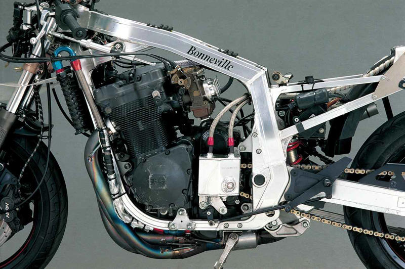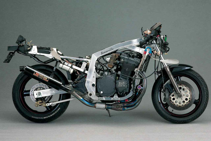 ヨシムラがGSX-R1100(主に1987年型や1988年モデル)をベースに全日本TT-F1などで培った技術を注ぎ込んで徹底的に磨き上げたトルネード1200ボンネビル。公道で走る楽しさを追求した究極のスーパースポーツは、実に特別な一台だったのである。まとめ:オートバイ編集部/協力:RIDE編集部ヨシムラ「トルネード1200ボンネビル」概要YOSHIMURA TORNADO 1200 BONNEVILLE国内外のサーキットで培った技術を礎として開発された「ボンネビルキット」ヨシムラトルネードボンネビルは、いつの日か自らの手でモーターサイクル(レーシングマシンにあらず)を送り出すことをひとつの目標に定めるヨシムラが、そのテストケースとしてスズキGSX-R1000をベースに、究極のスーパースポーツ、コンプリートモデルとして造り上げた一台である。そう、これと同じものは、この世に2台とないのだ。ただし、高い技術力と生産能力をも併せ持つヨシムラは、コンプリート車を市販はしない代わりに、「ボンネビルキット」と呼ばれるパーツ群を販売していたため、このキットを組んだ車両が何台か存在する。ボンネビルのベースとなったのは1988年モデルだが、1989年モデル向けのボンネビルキットの開発も行われていた。ともあれ、ボンネビルが「世界最速のストリートバイク」という名誉を維持するマシンであったことは間違いはない。画像1: ヨシムラ「トルネード1200ボンネビル」概要ボンネビルのエンジンは純正の76×58mm、1052ccをボア78mmのピストンを使って1108ccへ拡大し、カムシャフト、バルブスプリング、キャブレターなどを変更したものだ。試乗車は、これら全てに加えて、念入りなバランス取りをはじめとするヨシムラワークスレーサー並みの作業が施された上で、キャブレターに限定販売のヨシムラ・ミクニΦ40mmフラットバルブが採用されていた。ステージ別の出力は、ノーマルの130PS/8500rpmのプラス10PSくらいから設定されているが、この試乗車はなんと170PSと、同社F1マシンより最高速度は上である。また、フロントフォーク、リアショック、ホイール、ブレーキなども大幅に変更されていた。ボンネビルを走らせると、「圧倒的」という言葉しか思い浮かばないほどに速い。300km/hオーバーする最高速度は到底試せるものではないが、その3/4程度までならごく気軽に楽しめてしまう。それが可能なのは、単に馬力があるからではなく、ピークヘ至るまでの出力特性のよさ、それを完璧に受け止めることのできるシャシー系の実に素晴らしい仕上がりなどによるものだった。これだけの実力車を乗りこなすのは並のテクニックでは不可能だが、注意深く操れば、その片鱗を堪能することはできる。そして、そのレベルでさえ、得られる喜びの大きさは、何物にも代えがたいと言い切れるだろう。当時で1100ccをオーバーする排気量のエンジンが軽々と12000rpmまで回り、コーナーの立ち上がりではライダーがその気になればウイリーすらしてしまうほどの馬力を見せつけながら、それでもコントロール可能な範囲内にある、この仕事ぶりは、いくら称賛しても称賛しすぎることはないだろう。初代トルネード・ボンネビルをベースとした「発展型」もある画像1: 究極のコンプリートマシン・ヨシムラ「トルネード1200ボンネビル」(1987-88年)を解説|GSX-R1100をベースとした世界最速のストリートバイクが誕生初代トルネード・ボンネビルをベースにしつつ、各部に細かく改良を加えた発展型も存在。赤と黒のヨシムラカラーやカーボン仕様となったサイレンサー、油圧作動式に戻ったクラッチ、ヨシムラ・ニッシン製ブレーキキャリパー、ニーグリップ部のフレームカバーなどが異なる。キットパーツとして販売されていた、いわゆるボンネビルキットは、エンジンパーツ/シャシーパーツ/スベシャルパーツに分かれ、個々は講入することも可能なように設定されていた。したがって、コンプリートモデルの台数としては少ないものの、キットパーツはカウルが300セット生産され販売されていた。※写真はオーナー車両のため、当時の仕様とは異なります。レーシングマシンのスペックを投入されたスペシャルマシンGSX-R1100を使ってヨシムラが製作したコンプリートモデルの正式名称が「ヨシムラ・トルネード1200ボンネビル」。市販品のレベルを超えたスペシャルパーツと、レースで培った技術をふんだんに注ぎ込んで、スポーツバイクとしての理想を追求・実現した車両として、ボンネビルはヨシムラ自身にとっても重要なマイルストーンと言えるだろう。ボンネビルの魅力は、全日本TT-F1で何度もチャンピオンを獲得したヨシムラが、公道で走る楽しさを追求してGSX-R1100を磨き上げた点にある。パワフルでよく止まり、よく曲がる。それを彼らの手法で徹底的に追求したのがボンネビルだった。エンジンにはΦ78mmピストン、カムシャフト、コンロッド、チタニウム製エキゾーストシステムが開発され、車体にもショーワのスペシャルショックや17インチのワイドマグネシウムホイ