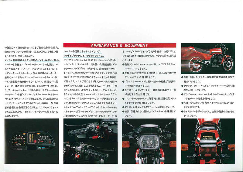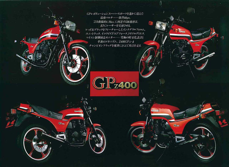 ライバル勢の猛追を受け、Z400FXを大幅にスペックアップさせた後継機「Z400GP」が登場。5PSアップのエンジンとクラス初のユニトラックサス、徹底したバネ下軽量化により、走りの性能が劇的に進化。レースベースとしても優秀なハンドリングを誇り、FXの「硬派なイメージ」に加え「走りの実力」で新たなファンを魅了した。まとめ:オートバイ編集部/協力:RIDE編集部、東京エディターズカワサキ「Z400GP」(1982年)の概要Kawasaki Z400GP 1982年総排気量:399cc エンジン形式:空冷4ストDOHC2バルブ並列4気筒 シート高:780mm 車両重量:179kg発売当時価格:47万8000円GPの名にふさわしい革新的な新技術を搭載ホンダ、スズキ、ヤマハのライバルメーカーが優れた4気筒400ccDOHCモデルを開発したため、登場以来高い人気を維持し続けたZ400FXも、ライバルに比べスペックで見劣りする存在になりつつあった。そこでカワサキはテコ入れのため、新型のZ400GPをデビューさせる。4気筒エンジンは依然DOHC2バルブ式だったが、ポートの拡大、吸気通路のストレート化、カムシャフトの変更、そして圧縮比アップ、キャブレターの変更などの改良で、Z400FXより5PSも最高出力を引き上げた。従来の丸型から角型のヘッドライトに変更された車体は非常に革新的で、クラス初のユニトラックサスペンションも採用。フロントフォークもエアタイプで、ブレーキはトリプルディスクとするなど、非常に豪華な内容だった。フロントブレーキにはZ400FXに使われたディスクよりも、有効径が4mm小さく、厚さが1mm薄いディスクをダブルで装着し、優れた効きとコントロール性を備えていた。リアディスクブレーキは、有効径はZ400FXと変わらないが、厚みが1mm薄くなっていた。旧型比で、バネ下重量はフロント側で3.5kg、リア側は6.5kgも軽量化された。Z400GPのキャストホイールに組み合わされる標準タイヤは、ダンロップのチューブレス。車格は大きめだが、Z400FXよりも軽く作ることに腐心して設計されているため、その扱いやすさは旧作よりもはるかに上だった。画像: カワサキ「Z400GP」(1982年)の概要ホイールベースはナナハンのZ750FXIIIよりも長い1445mmとなっていたが、Z400GPは徹底したバネ下荷重の軽量化により、優れたロードホールディング性とハンドリングを備えていた。プロダクションレースのベースモデルとしても優秀なその走りの良さから、Z400FX時代とは異なるタイプの、新たなユーザー層の獲得にも成功した。黒塗り仕上げのエンジンに合わせ、エキゾーストパイプとマフラーはブラッククロームメッキ仕上げを採用。ハンドルはジュラルミン鍛造製のセパレートタイプ。速度計と回転計などが並ぶメーター類には、オイルレベルモニターも含まれているのが特徴的であった。大ヒットモデルであるZ400FXの後継機種として登場したZ400GPは、革新的とも言える新機構のオンパレードで、性能面、機能面共に飛躍的に進化したモデルとなっていた。Z400GP ローソンレプリカ(1984年)画像1: カワサキ「Z400GP」(1982年)高性能化の波に応えて登場! Z400FXの後継モデル【空冷4発ヨンヒャク回顧録】追加で登場したライムグリーンバージョンの車体。シート形状はローソンレプリカタイプのシングルシート風を採用。フロントのセミカウルはオプションで用意されていた。カワサキ「Z400GP」(1982年)の各部装備・ディテール解説台形ケースで一体化されたアナログ2連メーターの中央には、燃料計とサイドスタンドなどの各種インジケーターを装備。ハンドルはセパレートタイプながら高い位置にマウントされていた。ライムグリーンの車体は限定車としてリリースされたもので段付きシートを採用。スタンダードモデルではパッセンジャー部分までフラットなタイプとなっていた。エンジンもZ400FXから発展したDOHC2バルブの空冷4気筒。吸排気系や各部の改良によって、最高出力はZ400FXの43PSから5PSパワーアップした48PSを発揮。Z400FXと同じ2本出しマフラーは、クロームメッキではなく、重厚感あるブラック仕上げとしたことで、より精悍なイメージを強調し引き締まったリアビューに仕上がっていた。キャストホイールの径自体はZ400FXと同じフロント19インチ、リア18インチ。ブレーキローターに冷却効率を高める不等ピッチの冷却孔が用意されたものを採用していた。カワサキ「Z400GP」(1982年)のカタログZ400FXから大きく変更されたエンジンやユニトラックサスペンションなどが事細かに記載されたカタログ。スタンダードモデルはファイアクラッカーレッドとエボニーの2色が用意され、3カ月後の7月に今回の記事でも紹介しているライムグリーンの車体が追加された。画像1: カワサキ「Z400GP」(1982年)のカタログ画像2: カワサキ「Z400GP」(1982年)のカタログ画像3: カワサキ「Z400GP」(1982年)のカタログ画像4: カワサキ「Z400GP」(1982年)のカタログ画像5: カワサキ「Z400GP」(1982年)のカタログカワサキ「Z400GP」(1982年)の主なスペック・当時価格まとめ:オートバイ編集部/協力:RIDE編集部、東京エディターズ関連のおすすめ記