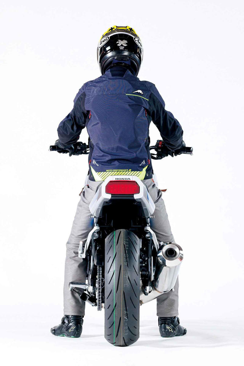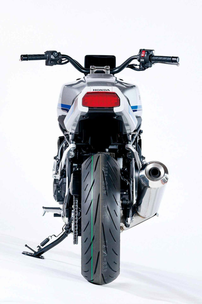 そして、正面や真後ろから見ると際立つのがワイドなハンドルバー。CB750Fの名声を高めるきっかけになった、1980年代のAMAスーパーバイクレーサーを思わせるワイドぶりで、ハンドルのセット位置も手前なので、ライダーの上半身はかなり起きた、アップライトなライディングポジションとなる。市販化され、実際にまたがるチャンスが来たら、ぜひまたがって体感して欲しい。想像以上のリラックスぶりに驚くはずだ。