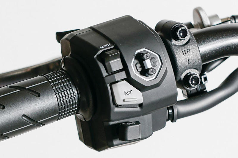 左スイッチボックスはホーネットと同タイプで、十字のセレクトキーを備えた新作。「MODE」ボタンはライディングモード選択用と思われる。