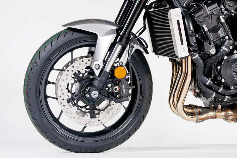 フロントまわりのパーツ構成はホーネットと同じ。ブレーキはニッシン製4ポットキャリパーにΦ310mmローターの組み合わせとなる。タイヤはBS製のS22。