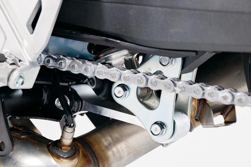 アルミ製のタンデムステップステーはガッチリした造り。シートレールとの締結位置が2本ショックのレイアウトに近く、リアまわりのルックスを向上させている。