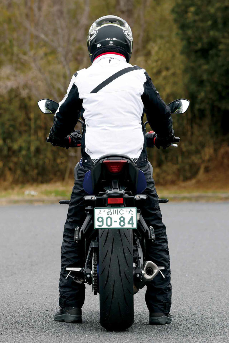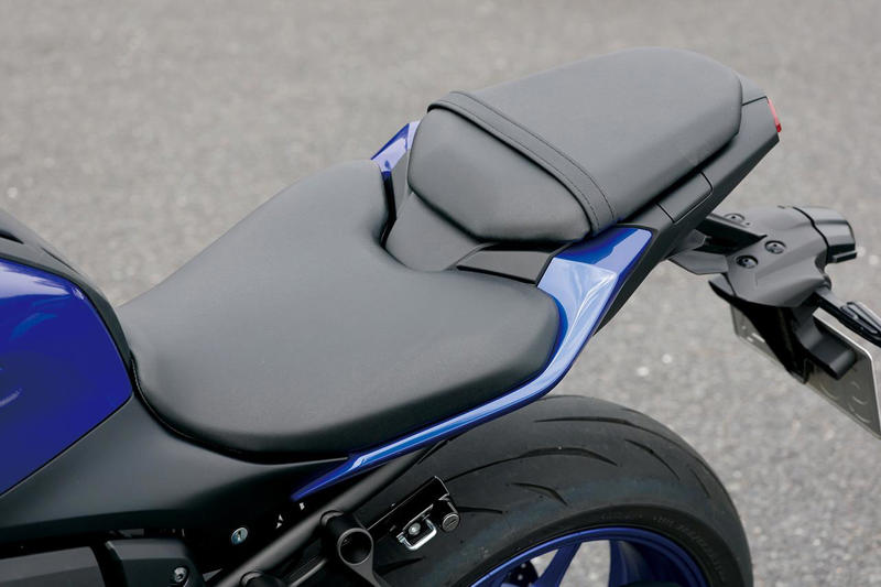 幅が狭めのハンドルと適度なバックステップ設定でオートバイとライダーの一体感が高い。ポジションはMT-07の伝統。シート高は805mmに抑えられているが、締まった前後サス設定でライダー乗車時の沈み込み量は少ない。