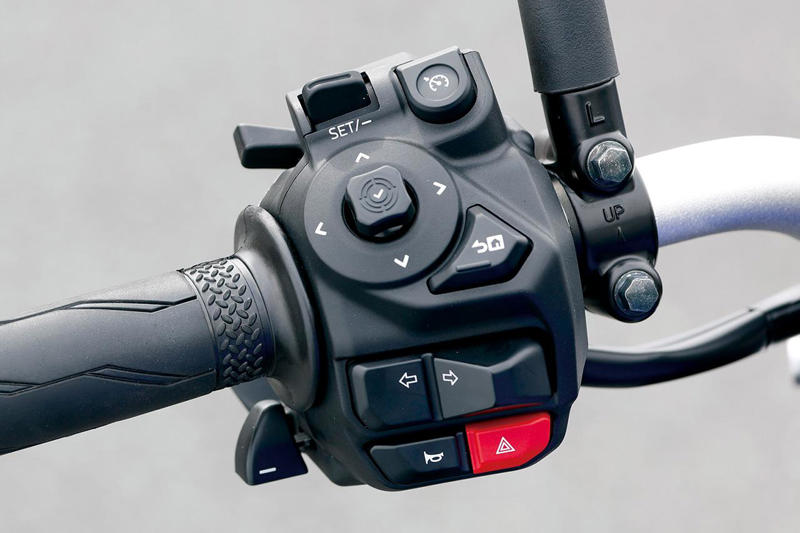 Y-AMT仕様はクラッチレバーもシフトペダルもないから、発進時は左側スイッチ部にあるシーソー式のレバーで1速に入れ、スロットルを開くだけ。半クラッチ時間が短いうえに1速ギアでの発進なので、スクーターのように無節操に開けると強烈にダッシュするが、トラクションコントロールが上手に介入するのでホイールスピンを起こして慌てることはない。