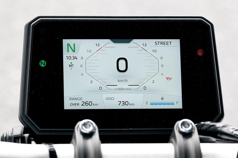 メーターは前モデルでも5インチカラーTFTだったが表示内容を一新。画面モードは4種類、ライディングモードは3種類。