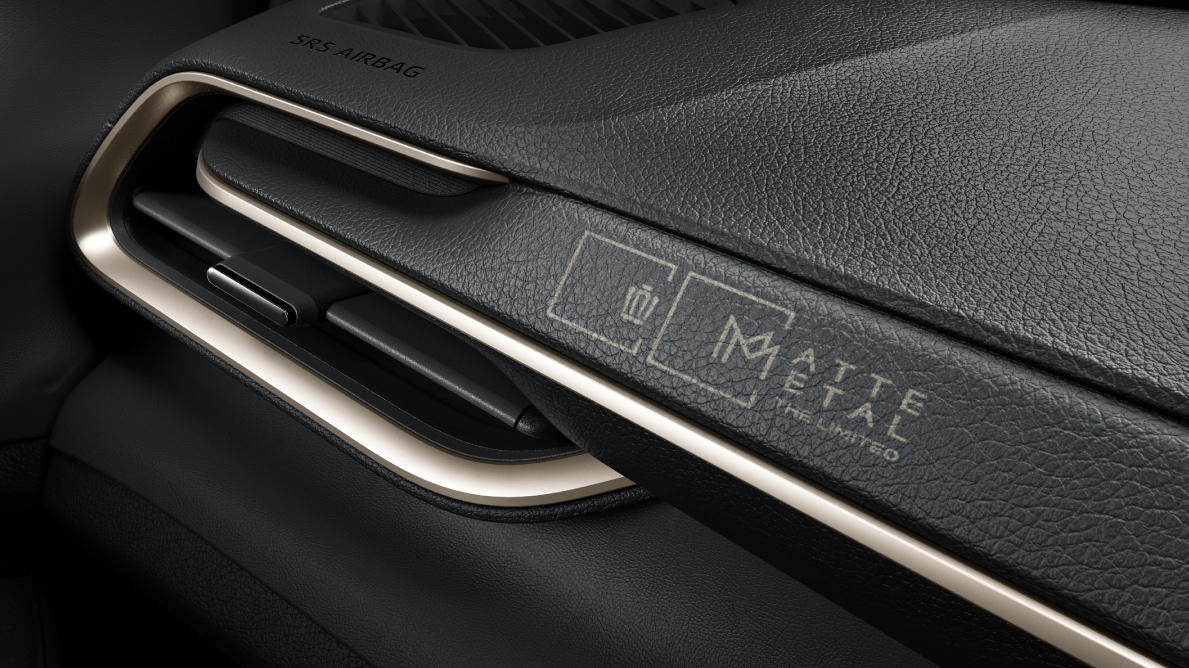 ボディーカラーには専用の「マットメタル」をチョイス。最表面にはマット塗装のメンテナンスを楽にする「特殊表面処理(TMコート)」を施しており、匠(たくみ)の技術で薄膜かつ均一に仕上げ、マットの外観に影響を与えずに持久力のある防汚性と汚れ除去性を実現したという。マットブラック塗装の21インチアルミホイール(235/45R21タイヤ&21×8 1/2Jアルミホイール&センターオーナメント)も採用している。