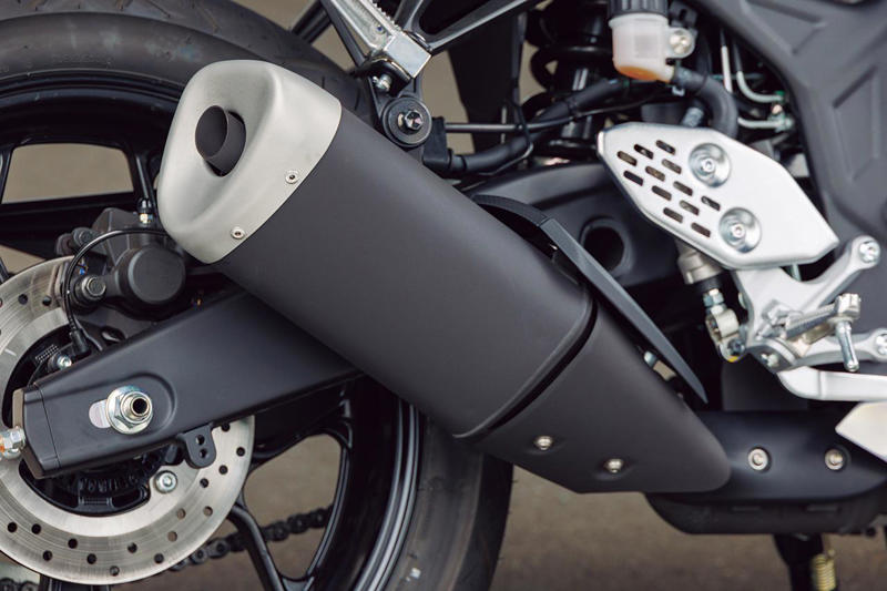 三角デザインのサイレンサー形状自体は従来モデルから変わらない。YZF-R25はステップのヒールプレートが穴あきタイプとなる。
