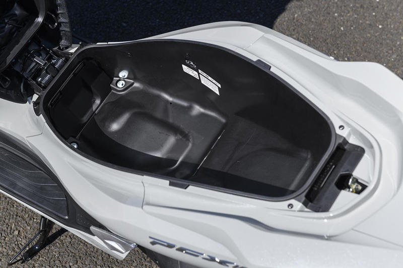 シート下のトランクは容量30Lで従来通り。大きくはね上がるシートのおかげで荷物の出し入れがしやすく、開口部も大きい。