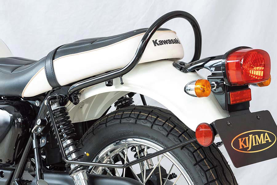 荷物積載にも重宝するタンデムグリップ(1万5400円)、写真内の下側にはW230専用のバッグサポート(1万450円)も写りこむ。