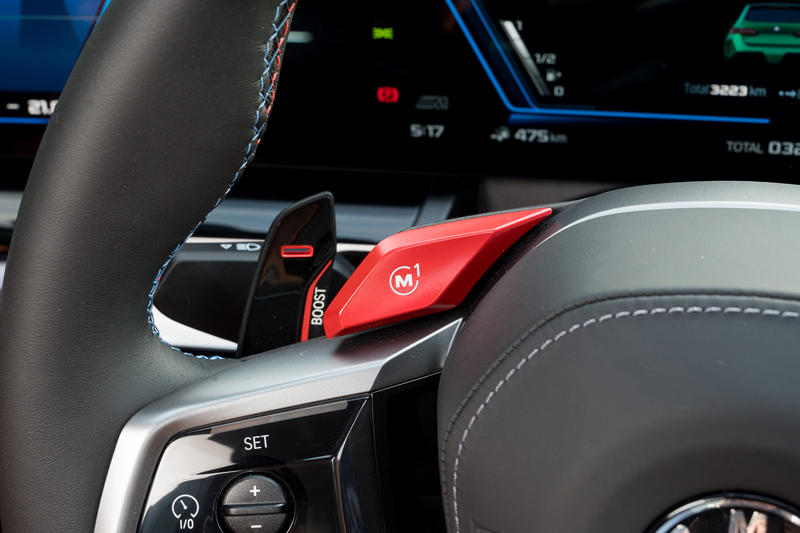 当然、前後トルク可変制御4WDのM xDriveだが、そもそもが全長5mを超える大柄なボディーのうえに、容量22.1kWhのリチウムイオン電池を搭載するPHEV(EV走行換算距離はWLTCモードで70km)で、しかもステーションワゴンとくれば車重がかさまないわけがない。2.7t余りのXMほどではないが、M5ツーリングの車重は2490kgとほぼ2.5tもある。それにもかかわらず、0-100km/h加速は3.6秒(M5セダンは3.5秒)、最高速は本来250km/hに制限されるが、例によってオプションの「Mドライバーズパッケージ(MDP)」を選べば305km/hまで引き上げられるという。この試乗車は「Mレーストラックパッケージ」を装着しており、そのなかに上述のMDPやカーボンセラミックブレーキなどが含まれる(168万5000円のオプション)。