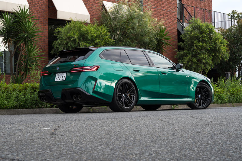 明るめのグリーンのボディーカラー「アイルオブマングリーン」のおかげで幾分和らげられているようだが、その威圧感は半端ではない。大谷翔平選手の太ももまわりもかくやというほどにパンパンに張り出したフェンダーの迫力、そしてそのなかにいかにも頑強そうなホイールやハブ、カーボンセラミックディスクがみっちりと詰まっている。おかげで全幅は1970mmというから普通の「5シリーズ」よりも70mm幅広い。しかもこれが実用性も求められるステーションワゴンというのだから、異様でさえある。