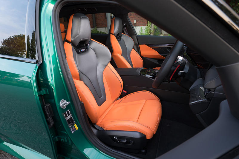 オプション装備:ボディーカラー<アイルオブマングリーン>(0円)/エクステンドレザーメリノインテリア<キャラミオレンジ×ブラック・ブラック>(8万5000円)/Mレーストラックパッケージ<Mドライバーズパッケージ、Mカーボンセラミックブレーキ、20/21インチMライトアロイホイール、ハイパフォーマンスタイヤ>(168万5000円)
